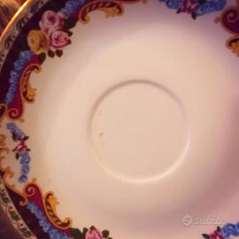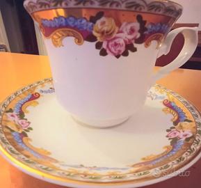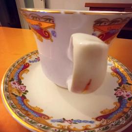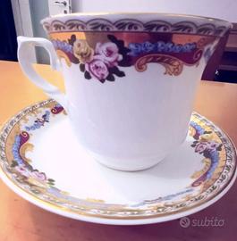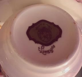 Tazza più piattino marchio Limoges porcellana bianca dipinta a mano con rose multicolore