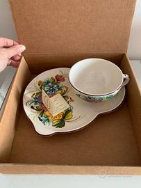 Prodotto prezioso dell'artigianato locale. Una classica tazza da prima colazione con tanto di piatto capace di contenere biscotti o fetta di torta. Dotato di certificato originale di produzione e scatola regalo. Anche cessione a mano presso il Centro Commerciale Gran Sasso di Teramo