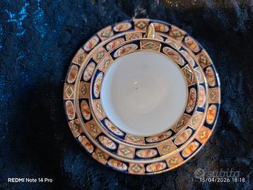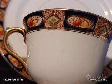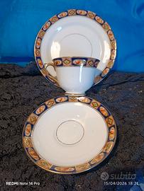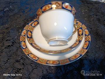 Tazza da te con piattino e piatto per dolci. Porcellana inglese anni '20, decori in blu notte, ruggine e oro ottime condizioni,