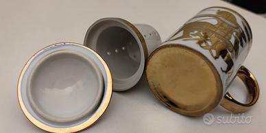 Tisaniera finemente decorata color oro composta di tre pezzi: tazza, filtro, coperchio. Adatta regalo di prestigio. Mai usato, in confezione originale
