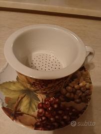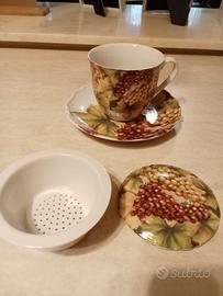Vendo bellissima tazza tisaniera, Victor Collection, marchio Victor Philippe, con coperchio, filtro e piattino in coordinato. Stampa autunnale. Usata SOLO UNA VOLTA