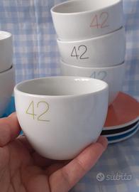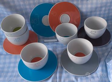 Ormai introvabile set di tazze con piattini per 6 persone firmato Benetton. Collezione fine anni'80 in perfette condizioni pari al nuovo.