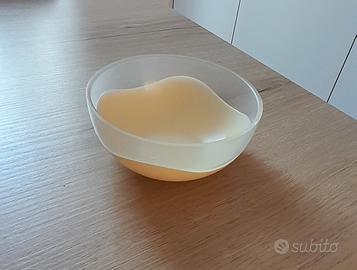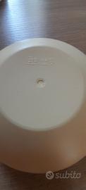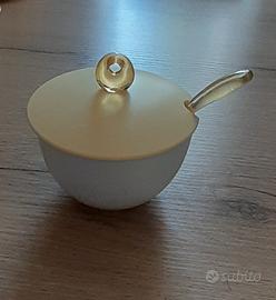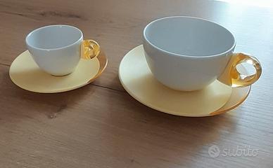 Set Guzzini da 2 tazzine caffè con piattino, 2 tazze caffelatte con piattino, 2 coppette gelato, 1 zuccheriera con cucchiaino. Piattini e coppette sono in materiale plastico resistente (SAN di Guzzini), tazze e zuccheriera in ceramica. Come nuovi.