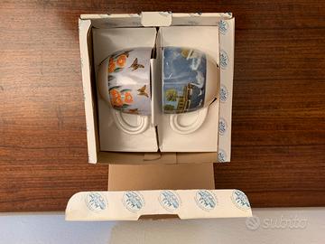 Set di 2 tazze da colazione in porcellana, dipinte con farfalle e cigni. Complete di piattini.