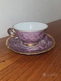 Elegante set di tazze con piattini, realizzate in porcellana con finitura madreperla. Ceramica Etruria Sesto Fiorentino.