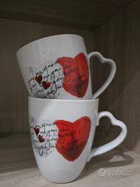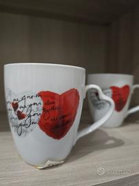 Due tazze che mi sono state regalate diverso tempo fa ma che non ha più senso tenere e mostrare in vetrina, raffiguranti cuori bicolori con scritte all'interno, dall'etichette sotto dovrebbero essere state acquistate da Conforama, vendo a prezzo modico la coppia euro 10. Sono due tazze grandezza media da thè. Condizioni ottime.