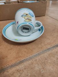Tazzine da caffè con piattino, in porcellana, brand Fizzy Moon, con scritta "Tanti auguri a te!". Nuove in scatola, mai utilizzate.