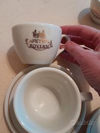 7 tazze da tè o da cappuccino con 2 piattini, vintage anni 50, brand Caffè Roversi. La scritta è in oro zecchino.