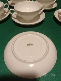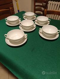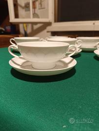 n. 6 tazze da consommé Rosenthal in porcellana bianca con motivo a foglia in rilievo, complete di piattino. Misure tazza: altezza 6 cm, diametro 12 cm; diametro piattino 16 cm