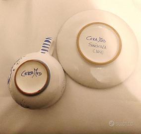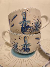 Tazze da tè con piattini di artigianato sardo Ceramed con pavoncella sarda. Condizioni come da foto