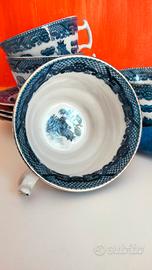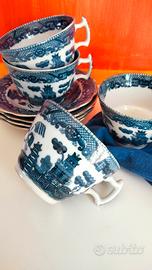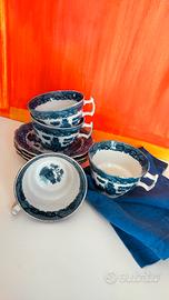4 tazze da te con piatto, in porcellana riccamente dipinta in blu cobalto con motivi orientali, sia all'esterno che all'interno delle tazze, tutto sottolineato da profili in oro.