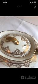 Servizio ROYAL ALBERT da te ‘ con decorazioni in oro , 6 tazze con doppio piattino, zuccheriera lattiera caffetteria e alzatina , la teiera ha il coperchio con una piccola crepa come da foto. La spedizione è a carico dell’acquirente.