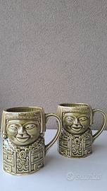 due rare tazze giapponesi con manico degli anni '70 in ceramica smaltate di verde alte 12 cm per 8 di diametro. ogni statua raffigura un volto di samurai