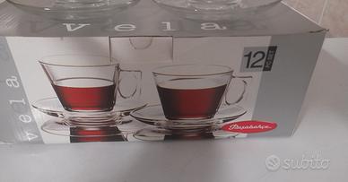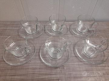 N.6 tazze in vetro con piattino trasparenti. Misura leggermente pii grande di una tazzina da caffè. Disponibilità 4 scatole. Nuove, mai utilizzate.