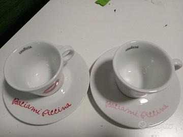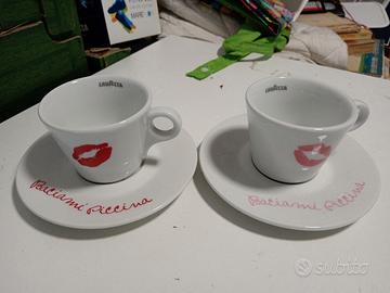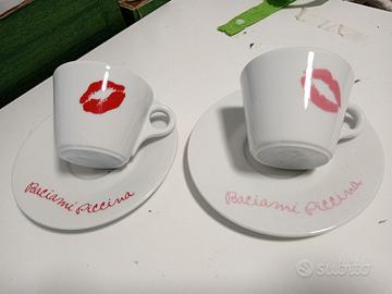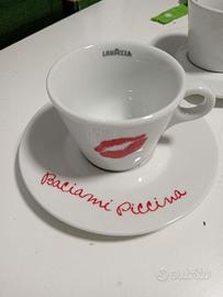 2 Tazze lavazza con piattino in ceramica bianca con labbra e scritta in rosso e in rosa. Collezione baciami piccina Nuove senza scatola