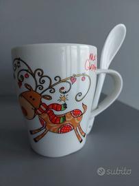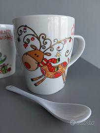 Vendo due deliziosi mug in porcellana con fantasie natalizie, con cucchiaino in porcellana riponibile all'interno del manico. Uno con stampa albero di natale, l'altro con renna, entrambi con scritta Merry Christmas.