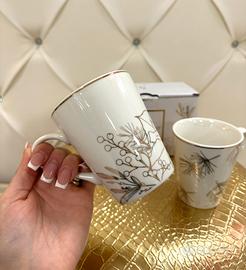 Set di tazze in ceramica dal design raffinato ed elegante, impreziosite da delicati decori botanici nei toni dell’oro, perfette per creare un’atmosfera calda e natalizia. Ideali per tè, caffè o tisane, aggiungono un tocco di stile alla tavola o ai momenti di relax.