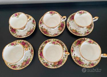 Tazze da the in porcellana Royal Albert Country Roses. 6 tazze da the con piattino, diametro tazze 9 cm altezza 7 cm, diametro piattino 14 cm.