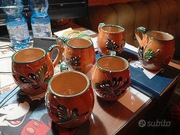 Set di sei tazze in terracotta decorate a mano. - Design vintage unico. - Finitura smaltata colorata. - Manici ergonomici.