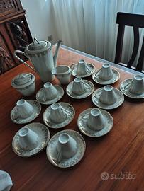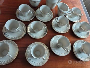 completo per il cafè vintage da 11 tazze con piattini ,colore panna con dorato... zuccheriera... teiera...in porcellana tedesca...con qualche sbiancamento appena, appena del tempo.molto classico e elegante!!