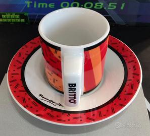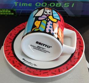 Elegante tazzina da caffè con piattino, caratterizzata dal vivace design artistico di Romero Britto.