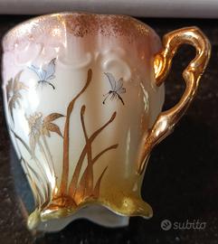 Tazzina e piattino da caffè in porcellana francese art nouveau. colori rosa e verde con immagini di libellule blu. Il prezzo è riferito ad 1 set , disponibili 2 tazzine.
