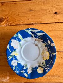Elegante tazzina da tè/caffè in porcellana finemente decorata con motivi floreali su base blu e dettagli dorati. Il bordo della tazzina e del piattino è rifinito in oro, bella ed elegante, sul fondo è presente la scritta “Royal China”, anch’essa dorata che ne prova la autenticità e qualità. Un pezzo da collezione ideale per amanti del vintage, perfetto anche come idea regalo o per abbellire una credenza.