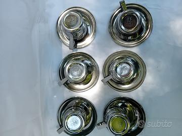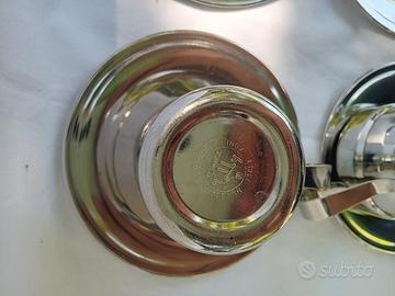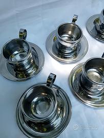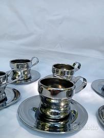 Vendo set originale composto da 6 tazzine da caffè complete di piattino, marchiate RIVADOSSI TERNA Jolly, interamente in acciaio inox, prodotte in Italia negli anni ‘70. Design elegante e minimal tipico di quel periodo, ideale per collezionisti o per chi ama dare un tocco retrò alla propria cucina o tavola.