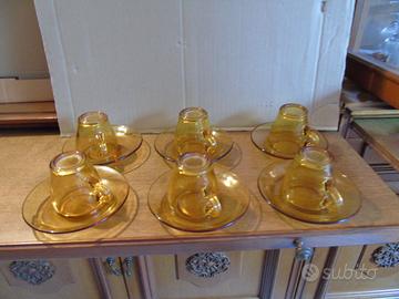 Set di 6 tazzine da caffè espresso, complete di piattini, originali in vetro ambrato anni 60, della Bormioli Rocco e Figli di Parma.
