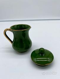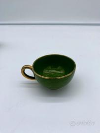 set di 3 tazzine da caffè e 6 piattini n.1 cafferriera e n.1 lattiera in ceramica coop Gualdo Tadino Italy colore verde con rifiniture oro vintange anni 40 segni del tempo