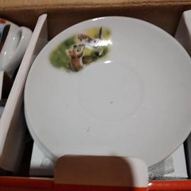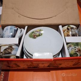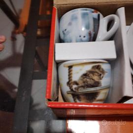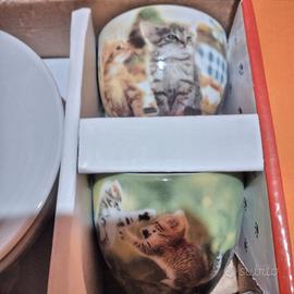 4 tazzine da caffè con piattini nella confezione originale, decorate con immagini di gattini tutte diverse tra loro