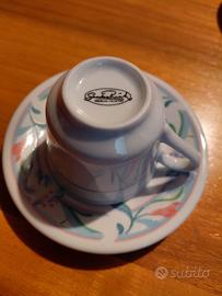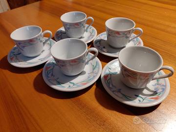 Vendo 5 bellissime tazzine da caffè e 5 piattini abbinati di un servizio, firmato Sandra Rich con motivo floreale.