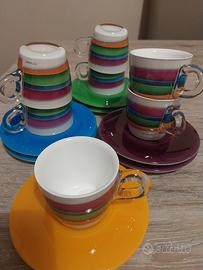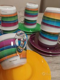 Set di 7 tazzine da caffè della Omada in melamina colorata, motivi arcobaleno e manico trasparente. MAI USATE!