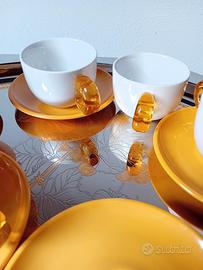 sei tazzine da caffè originali Omada , con tazza di porcellana e manico,piattino in plastica,tipica produzione di questa ditta. il set è usato,ci sono piccoli graffi sui piattini,. C'è una riga all'interno di una tazze, di produzione. Dovrebbero risalire a prima del 2000 e non è consigliabile metterle in lavastoviglie.