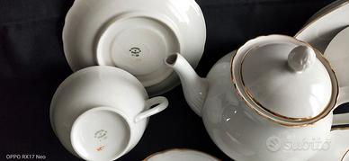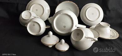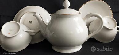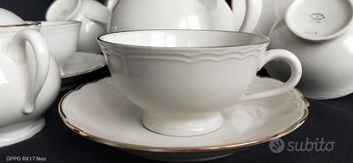 Vecchio Servizio da Tè o Caffè della manifattura RICHARD GINORI in porcellana Bianca con rifinitura in oro zecchino, composto da 4 tazzine e relativi piattini + 1 Teiera / Lattiera + 1 Zuccheriera.
