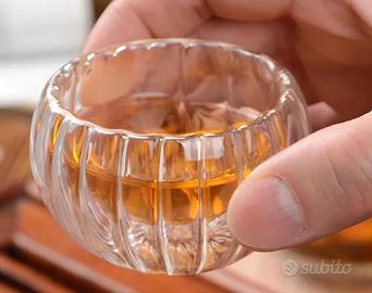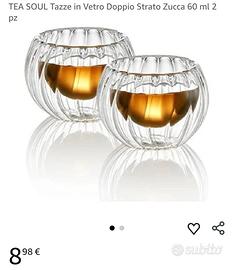 Set di 6 piccole tazzine in vetro doppio strato a forma di zucca, ideali per caffe espresso.
