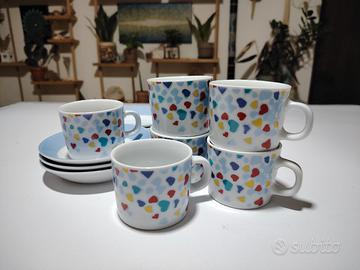 carinissime e allegre tazzine marchio Naj-Oleari con fantasia cuoricini colorati, piattini coordinati. nuove, complete di imballo originale