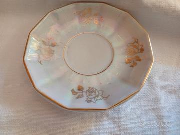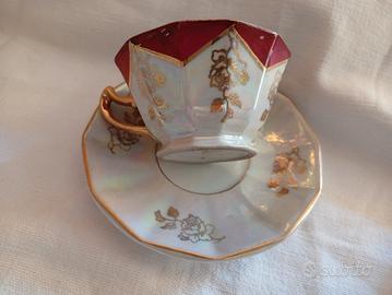 6 tazzine da caffè con piattini in porcellana con dettagli dorati Decorazioni floreali con bordura bordeaux