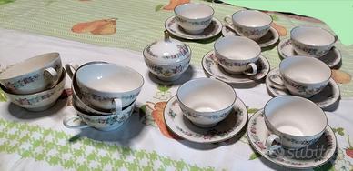 Vendo servizio antico in porcellana di alta qualità da the completo di 7 tazzine con piattino e altre 5 tazzine singole con zuccheriera in perfetto stato. In aggiunta vendo altri componenti simili caffeiera/lettiera, zuccheriera e salisiera con suo cucchiaio in ottimo stato. Vendo tutto in blocco. Solo ritiro, no spedizione.