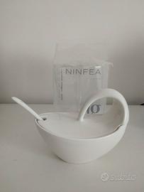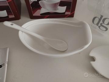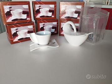 set di 6 tazzine di design in porcellana bianca, modello onda. Originali ed eleganti. In aggiunta, zuccheriera Dea Gourmet, modello Ninfea,in confezione originale