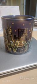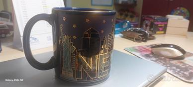 Tazza in ceramica con un design ispirato a New York. La tazza presenta uno skyline dorato e stelle su sfondo blu.
