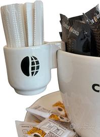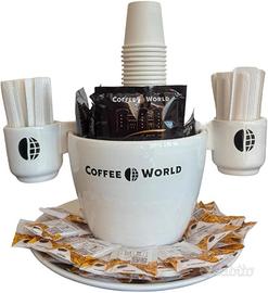 Coffee World, Tazzone artigianale con piatto in porcellana porta cialde, capsule, palette, zucchero,