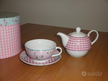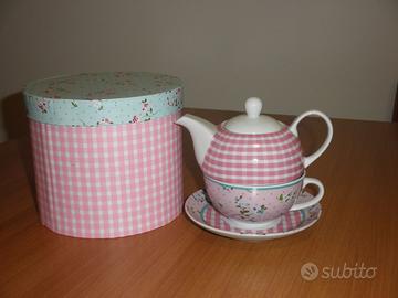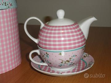 TEA-FOR-ONE, vendo causa inutilizzo. Set teiera da the con tazza e piattino per una persona, con bella scatola. Perfetto per un regalo. Mai usato. Regalo bollitore rosso con fischietto usato pochissimo, ottime condizioni.