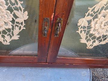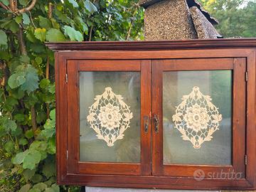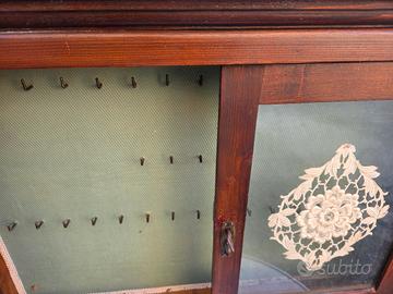 teca legno completa di ganci per appenderla ,sportello in vetro decorato con macrame ,chiavi e seratura perfettamente funzionanti ,color noce.