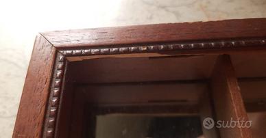 Teca in legno con scompartimenti separati e specchio sullo sfondo.