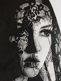 L'opera è costruita su un contrasto estremo e magnetico: la pelle chiara del viso emerge dall'abisso di un intricato pizzo nero antico.