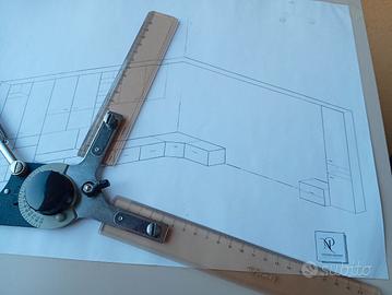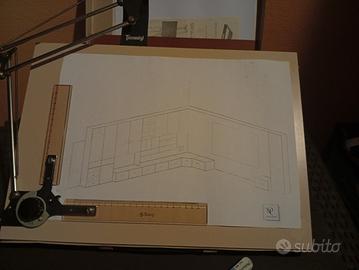 Tecnigrafo portatile, ottime condizioni perfettamente funzionante, con piano di lavoro in legno e squadre facile da montare e richiudibile in valigetta color cuioi, con istruzioni. Ottima manifattura.