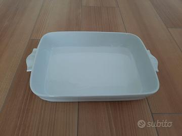 Teglia da forno bianca rettangolare in ceramica con inserti in silicone sulle maniglie per non scottarsi e sul fondo per poterla appoggiare senza rovinare il supporto.