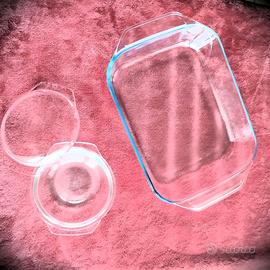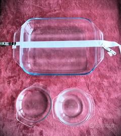 Vendo in blocco teglia mancata Pyrex e casseruola con coperchio marcata Sopalex. La teglia non è mai stata usata, quello piccolo ha invece qualche segno d'usura, nessuna crepa.