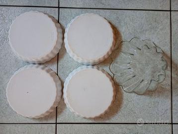 Quattro teglie in porcellana da forno diametro cm 18 + uno stampo in vetro per budino diametro cm 20. Peso totale kg 2,5